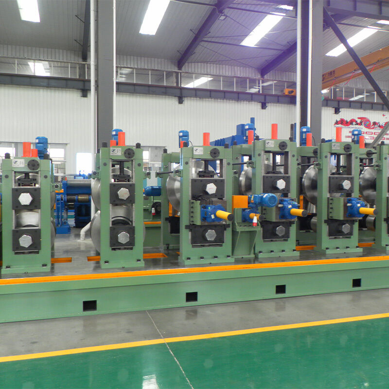 Diese ERW-Rohrherstellungsmaschine richtet das fixierte Band nach der Schlitzlinie aus und führt es der Formmaschine zu. Das Band wird durch Rollen in Rohrform gebogen, wobei die Kanten durch Hochfrequenzstrom geschmolzen und durch Quetschrollen zusammengeschweißt werden. Auch als Hochfrequenzrohrmühle bekannt.